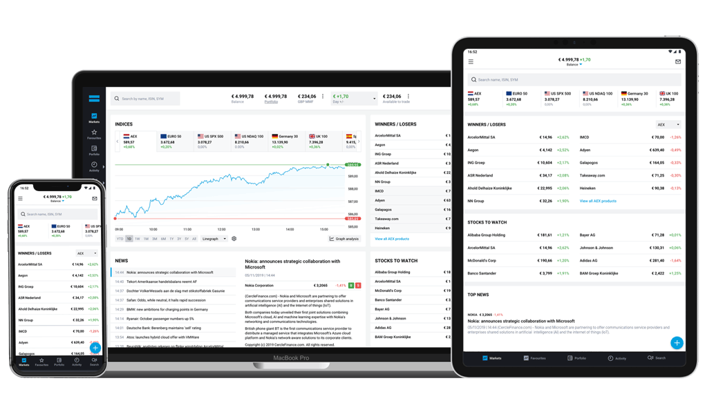 Saxo Bank is een gevestigde naam in de beleggingswereld en richt zich vooral op de ervaren belegger. Via het SaxoInvestor-platform krijg je toegang tot een enorm aanbod van aandelen, ETF’s, opties, futures en meer dan 60 beurzen wereldwijd. De kosten liggen iets hoger dan bij pure online brokers, maar daartegenover staan professionele tools, diepgaande analyses en solide Nederlandse toezicht door de AFM en DNB.