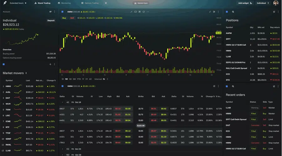 - Snel handelen: plaats orders direct vanuit de grafiek met één klik. Dit maakt Robinhood nu ook een serieus alternatief voor platforms als TradingView of de pro-tools van Interactive Brokers.