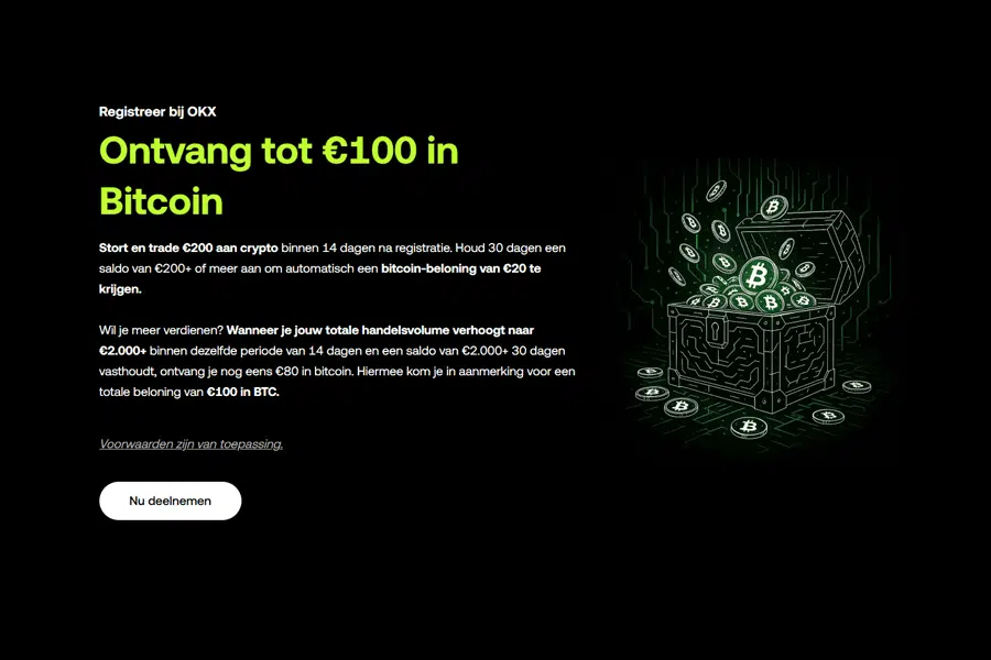 Direct na mijn storting ontving ik een melding over mijn verdiende welkomstbonus van €20. Dit verraste me positief. OKX biedt ook grotere bonussen (tot wel €100), maar daarvoor moet je aanzienlijk meer storten en verhandelen. Toch neem ik elke euro gratis crypto graag mee.