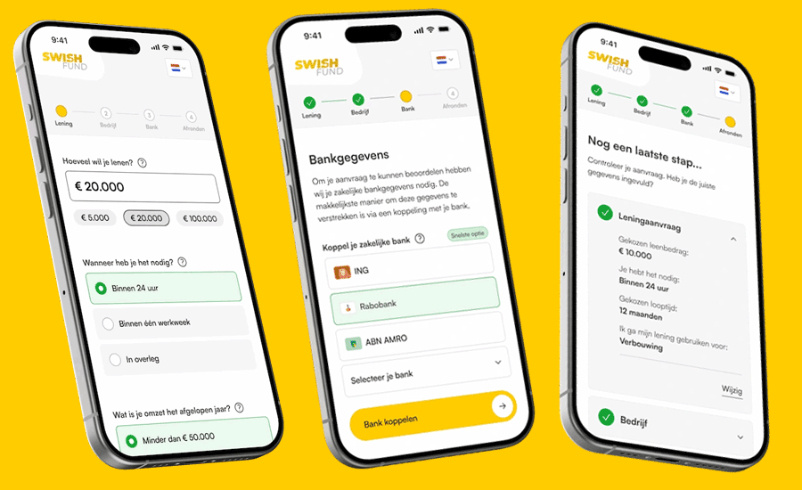 • Bedrijven die door traditionele banken zijn afgewezen. Swishfund hanteert soepelere toelatingseisen dan banken en kijkt breder naar je bedrijfssituatie.